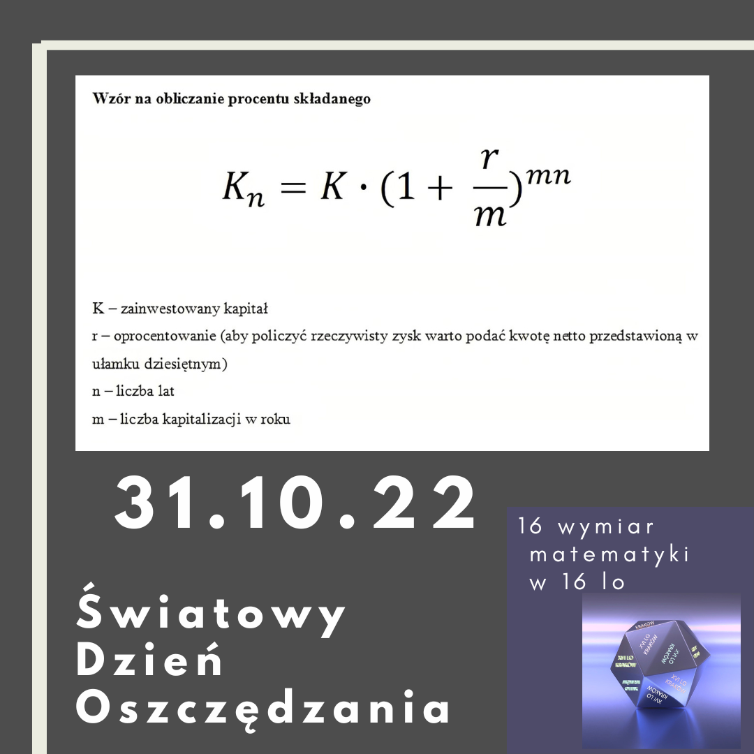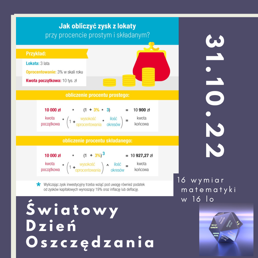 Światowy Dzień Oszczędzania - święto obchodzone corocznie 31 października powstałe z inicjatywy przedstawicieli banków europejskich podczas 1. Międzynarodowej Konferencji Kas Oszczędnościowych w Mediolanie w 1924 roku w celu zapewnienia stabilnego i długotrwałego rozwoju społeczeństw poprzez promowanie idei oszczędzania.Procent składany, to sposób oprocentowania kapitału początkowego, polegający na tym, że roczny dochód w postaci odsetek od kapitału jest doliczany do kapitału i procentuje wraz z nim w roku następnym.Kalkulator:https://czytosieoplaca.pl/procent-skladany.html